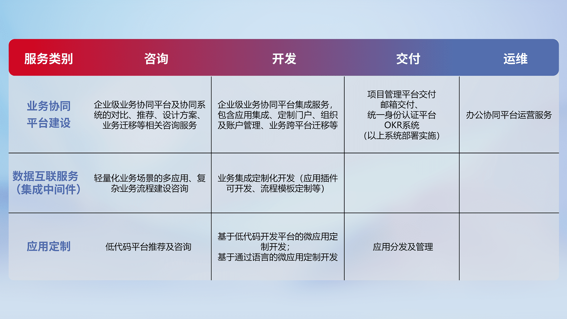 针对钉钉、、、企微、、IDaas等平台级产品提供产品的规划、、、方案、、、、交付、、定制化开发等服务,,,,实现如统一协同办公、、、、智能客户服务、、混合会议管理、、、、智能数据查询、、、、等业务场景,,,实现数字化转型。。。